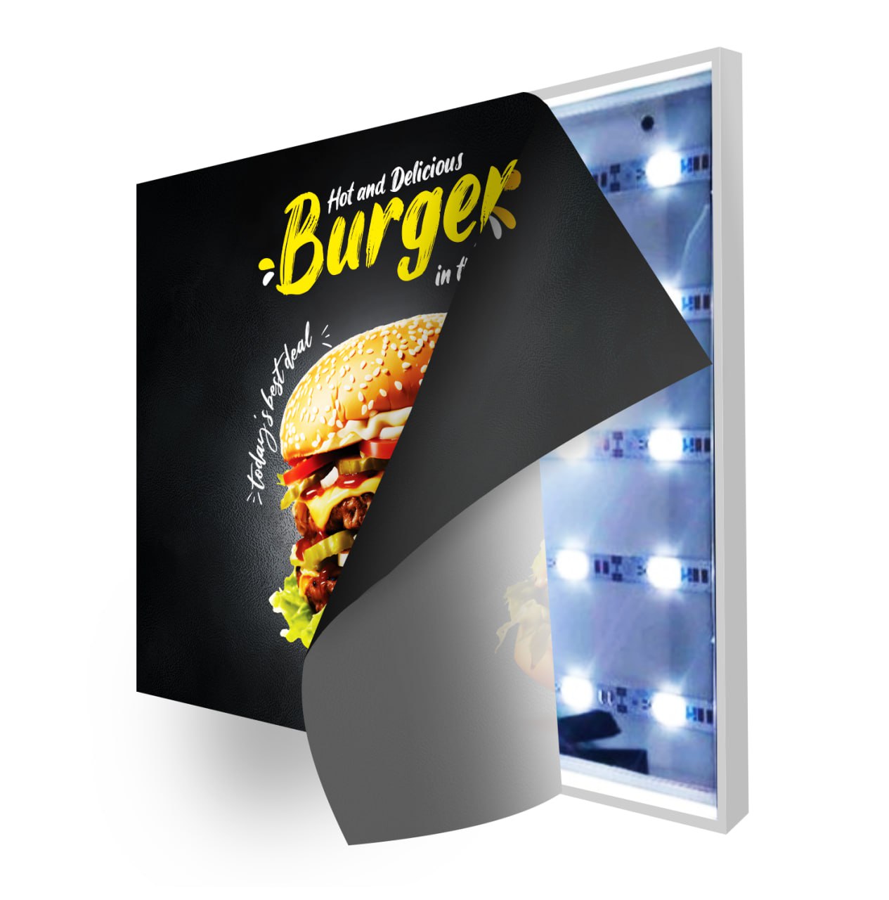 لایت باکس های فریم لس جهت دستیابی به حداقل فریم طراحی گردیده اند به گونه ای که تصویر کاملا به گوشه های قاب با نوار سیلیکونی که به گوشه های پارچه دوخته شده متصل میشود .چاپ تصاویر در لایت باکس فریم لس بر روی پارچه های مخصوص چاپ بک لایت انجام میپذیرد و امکان تعویض تصویر در چند دقیقه امکان پذیر میباشد .